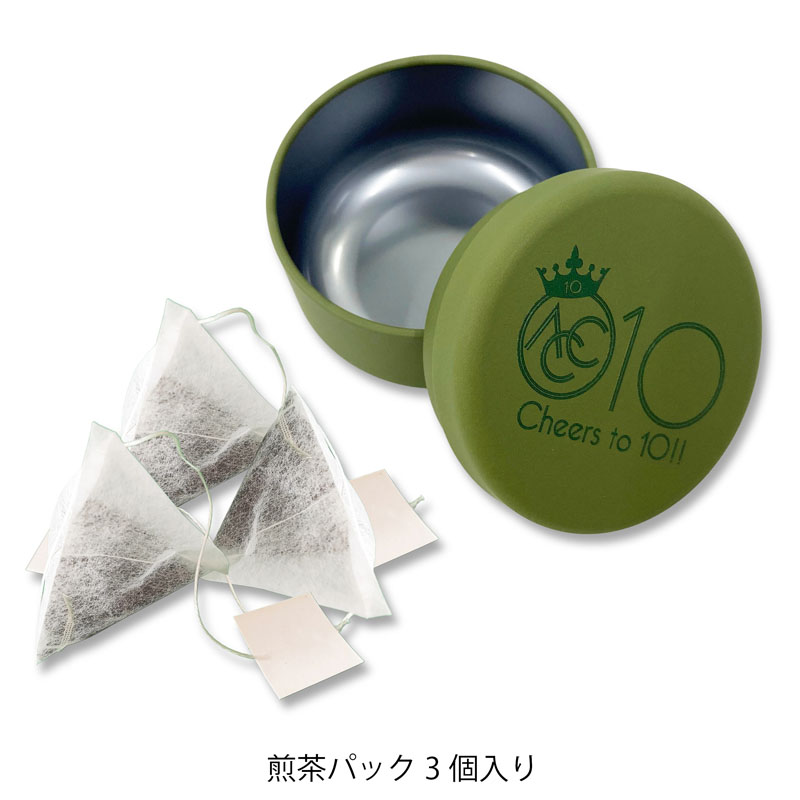 懐かしい魅力のオリーブ缶に10周年ロゴをあしらい、中には煎茶をセットしました。