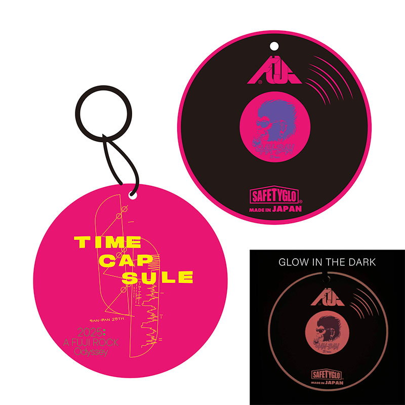 NASAのボイジャー探査機に搭載された「ゴールデンレコード」に着想を得て制作された本展覧会のロゴに着想を得て商品化されたキーホルダー。 表面の左のカプセルは映像データの走査線、右のカプセルは音声波形を象徴しています。 裏面は岩盤の語源でもあるレコード盤のイメージでデザインされています。暗い場所では別の色で光ります。 Made in Japan