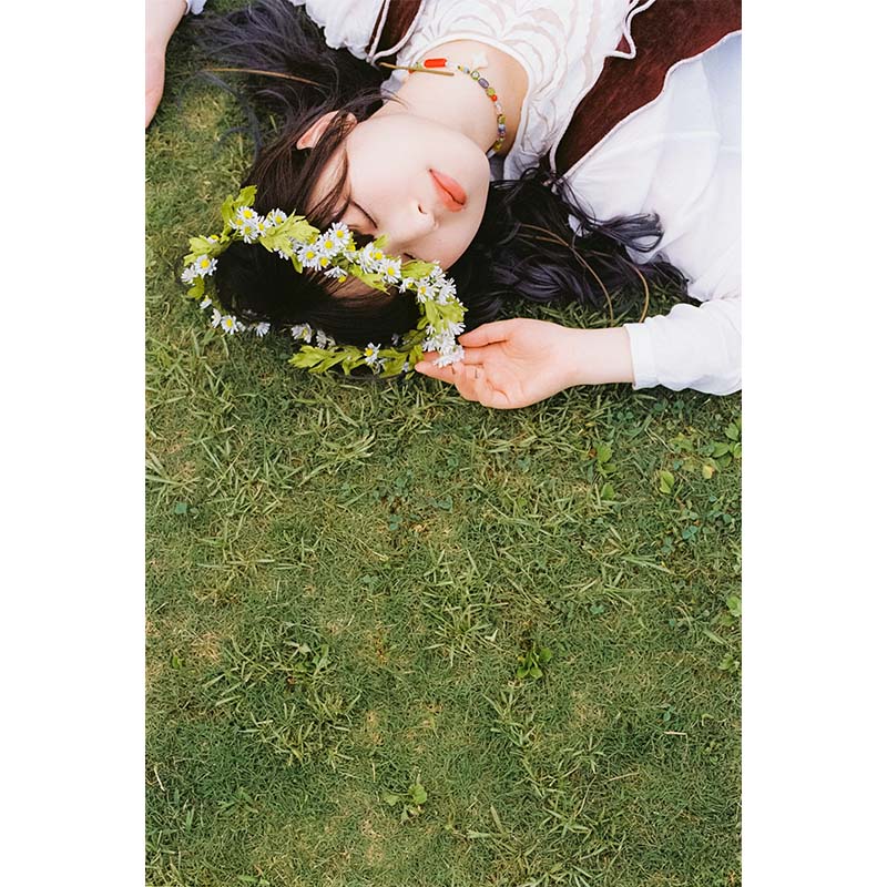 美しい夕暮れの草原で、野生の花で作った花冠がテーマです。
