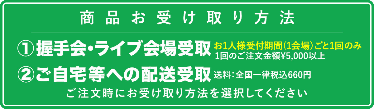・握手会/ライブ会場受取によるご注文は、商品受取日ごとにお1人様1回のみとなります。