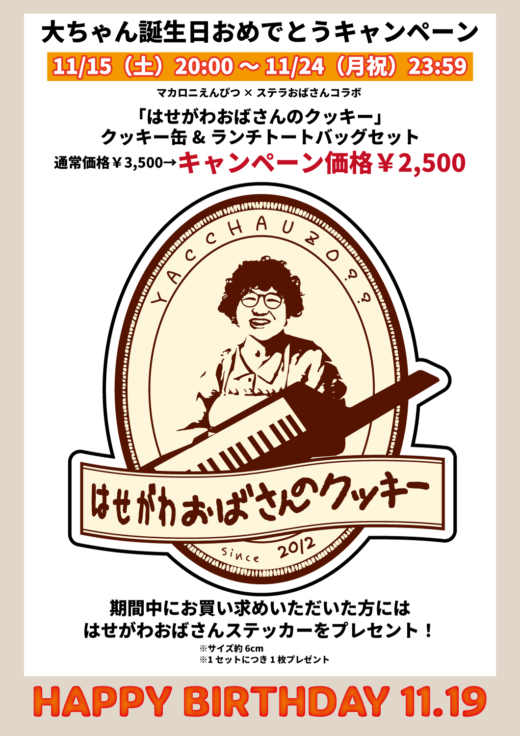 期間中、対象の"マカロニえんぴつ×ステラおばさんコラボ 「はせがわおばさんのクッキー」クッキー缶&ランチトートバッグセット"をご購入した方には「はせがわおばさんのステッカー」をプレゼント!!