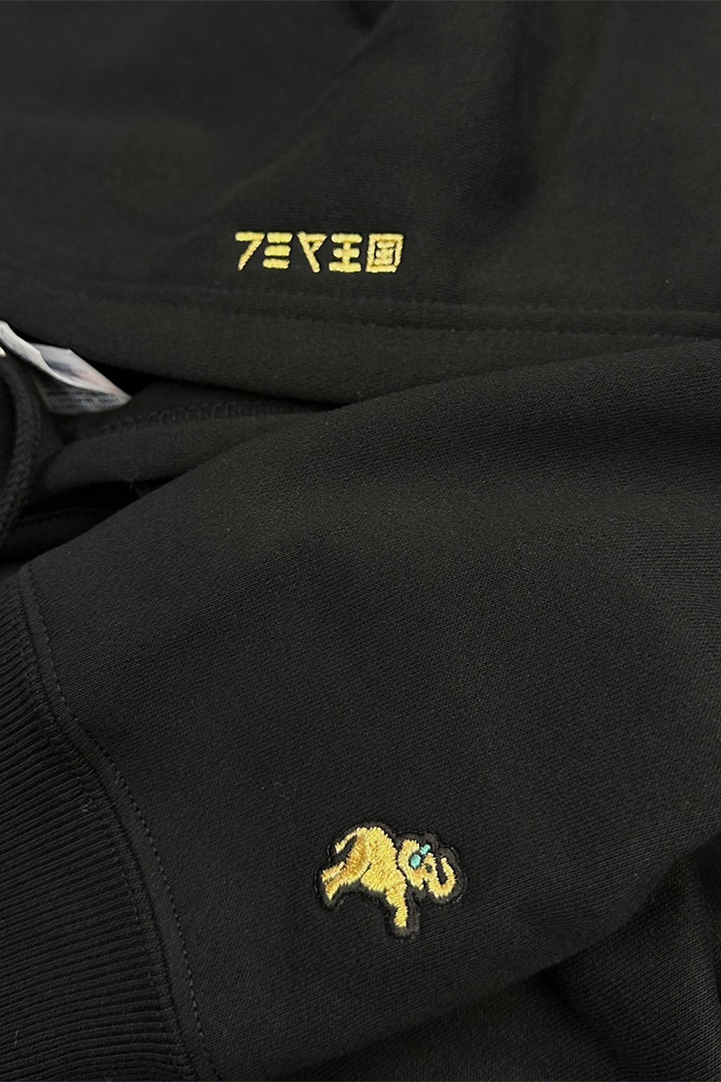 フードの前縁に「フミヤ王国」ロゴ、左袖口に象のマークを刺繍であしらったこだわりの1着。