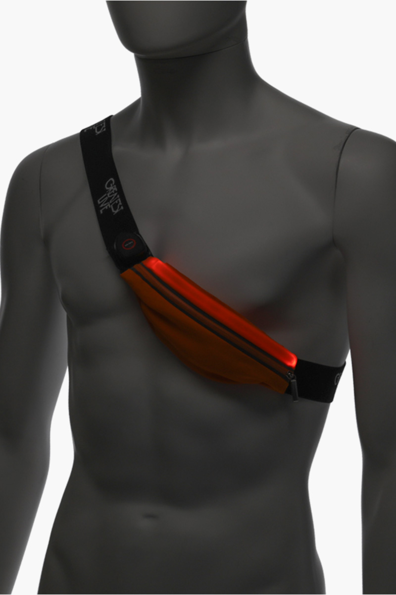 「GREATEST LIVE」のロゴを使用した、体にフィットする光るナローウエストバッグ。